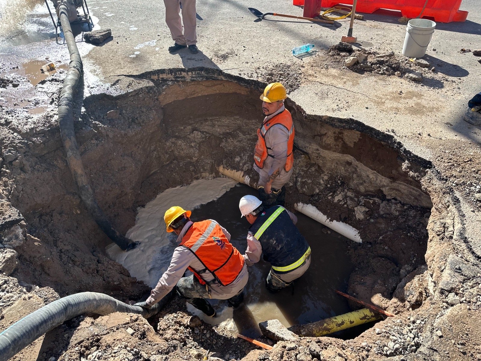 La Junta de Agua y Saneamiento de Juárez, trabaja en la reparación de una fuga registrada en la red general de agua potable en la Zona Centro.