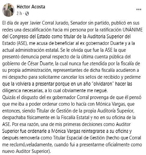 Chihuahua, Chih.- Tras su ratificación unánime como titular de la Auditoría Superior del Estado (ASE), el Auditor Superior Héctor Acosta Félix respondió en sus redes sociales a las críticas públicas emitidas por el senador neomorenista Javier Corral Jurado, quien lo acusó de favorecer al exgobernador César Duarte y a la actual administración estatal.