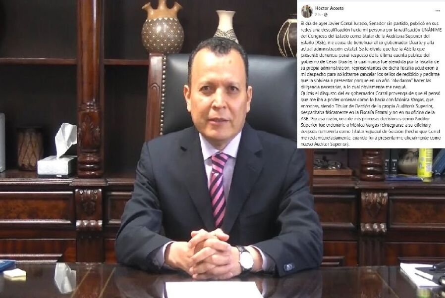 Tras su ratificación unánime como titular de la Auditoría Superior del Estado (ASE), el Auditor Superior Héctor Acosta Félix respondió en sus redes sociales a las críticas públicas emitidas por el senador neomorenista Javier Corral Jurado, quien lo acusó de favorecer al exgobernador César Duarte y a la actual administración estatal.