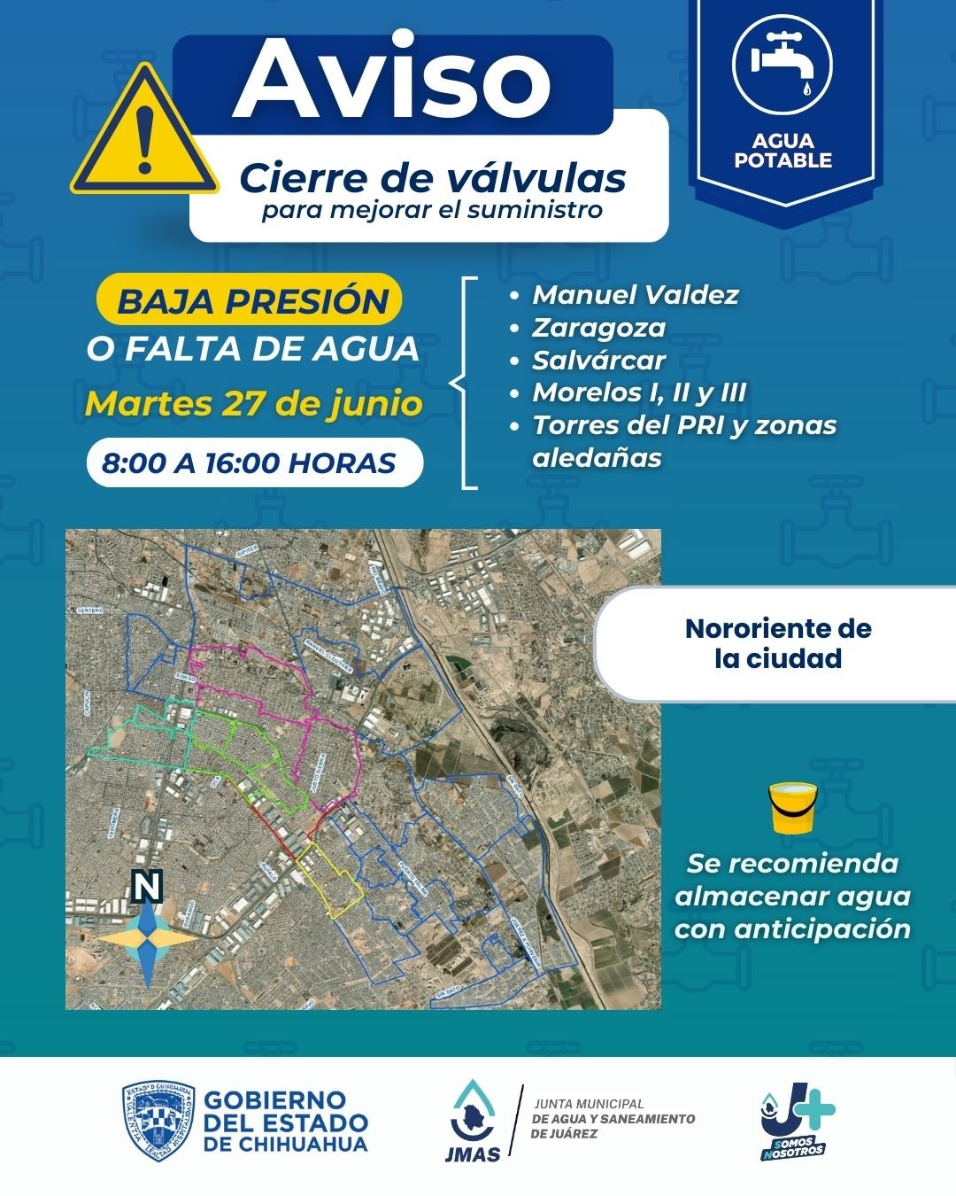 Durante el horario en el que se realizarán los trabajos y hasta que se equilibre el sistema, se podrá presentar baja presión o falta de agua potable en las colonias Manuel Valdez, Zaragoza, Salvárcar, Morelos I, II y III, Torres del Pri y zonas aledañas.