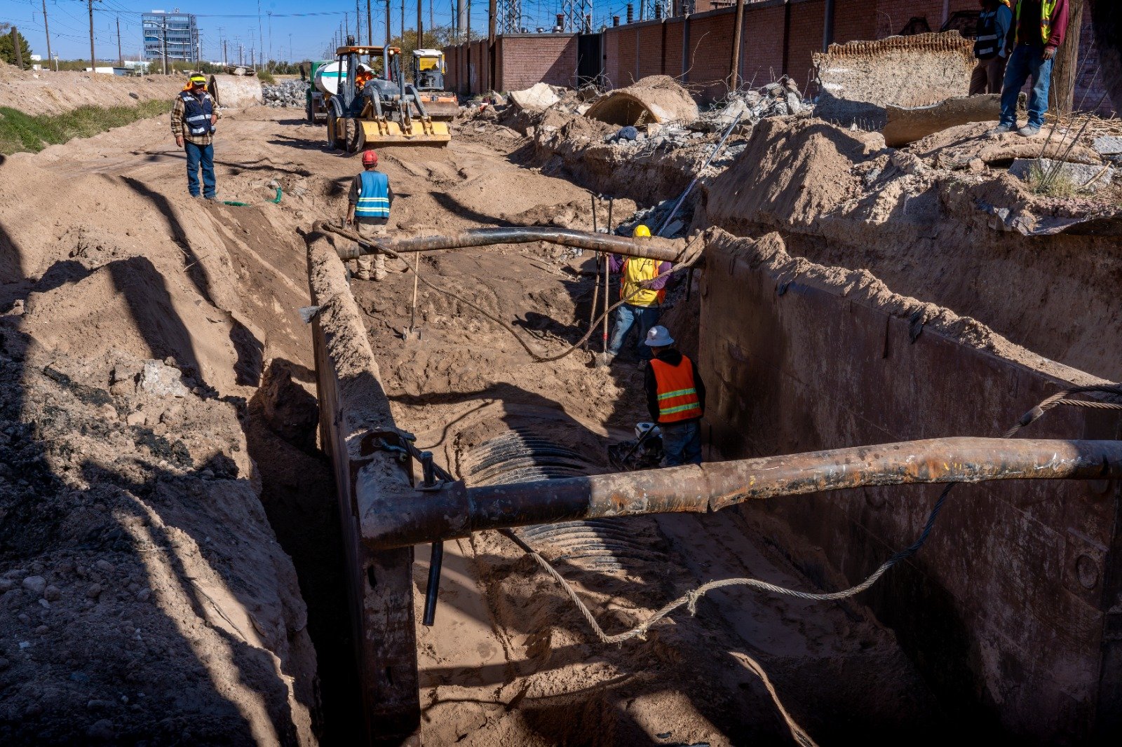 En total, la obra contempla la sustitución de 617 metros de tubería con un diámetro de 2.44 metros, con una inversión de 61 millones de pesos, beneficiando directamente a 441 mil juarenses.