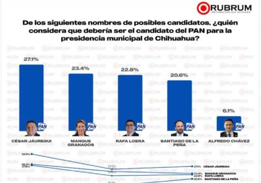 El Fiscal General del Estado, César Jáuregui, se mantiene como el perfil con mayor preferencia ciudadana para encabezar la candidatura del PAN a la Presidencia Municipal de Chihuahua, de acuerdo con la más reciente encuesta de la casa RUBRUM.