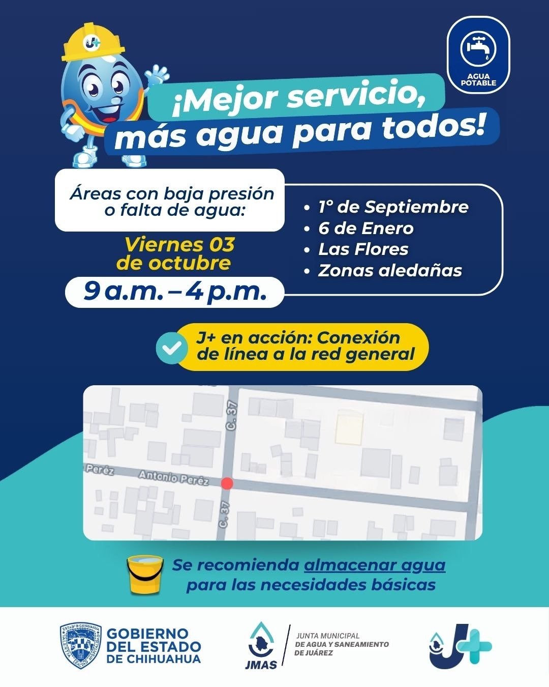 En consecuencia, se impactará la prestación del servicio en las colonias: 1º de Septiembre, 6 de Enero, Las Flores y zonas aledañas.