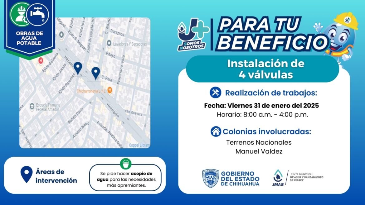 Dichos trabajos serán realizados mañana viernes 31 de enero, entre las 8:00 y las 16:00 horas, tiempo durante el cual se presentará baja presión o suspensión del servicio en las colonias Terrenos Nacionales y Manuel Valdez, en el sector de Zaragoza.