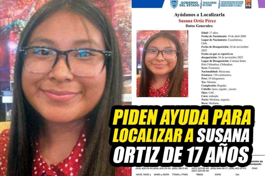 La Fiscalía General del Estado activó el Protocolo Alba para localizar a Susana Ortiz Pérez, una adolescente de 17 años que fue reportada como desaparecida este 24 de noviembre en la ciudad de Chihuahua.