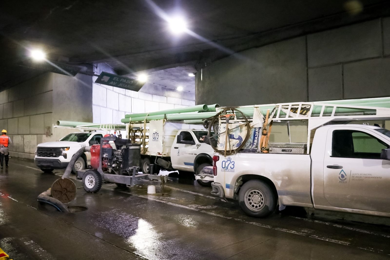 Ante las persistentes lluvias que se han registrado en la ciudad, de nueva cuenta el túnel de la avenida 16 de Septiembre ha registrado encharcamientos, por lo que, cuadrillas del área de Alcantarillado de la Junta de Agua y Saneamiento de Juárez realizan labores de desazolve y bombeo de agua acumulada.
