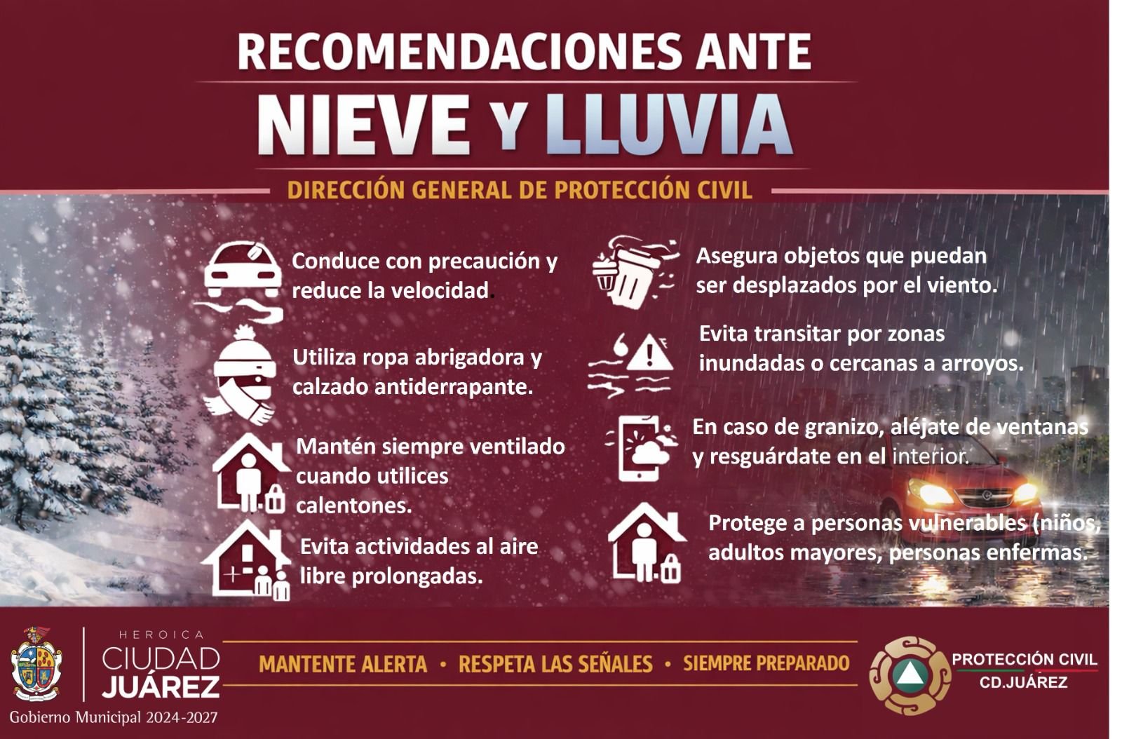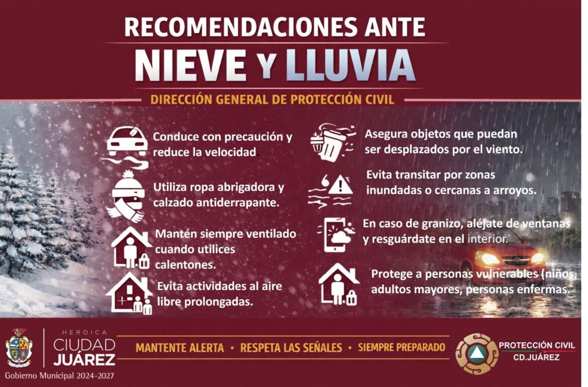 La Dirección General de Protección Civil emitió un aviso preventivo la mañana de este 25 de enero de 2026, ante la continuidad de precipitaciones en forma de lluvia, aguanieve y nieve en distintos sectores de la ciudad.