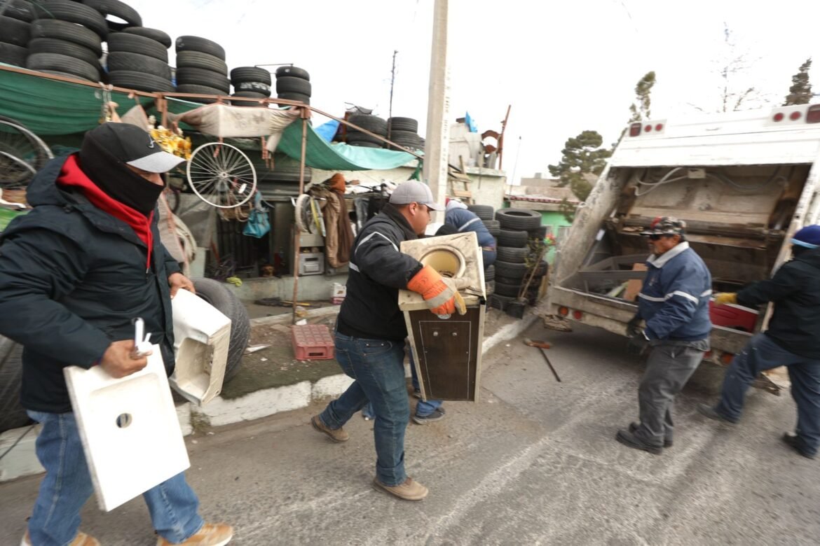 En un operativo en conjunto con otras dependencias municipales, la Dirección de Limpia retiró más de 18 toneladas de tiliches de un domicilio ubicado sobre la calle Minatitlán y eje vial Juan Gabriel en la colonia Fundidora.