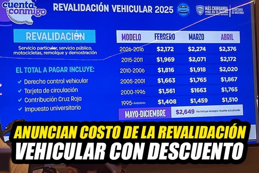 A partir del 1 de febrero, los propietarios de vehículos en Chihuahua podrán realizar el pago de la Revalidación Vehicular con descuentos de hasta el 50%, según anunció el secretario de Hacienda estatal, José de Jesús Granillo, en una conferencia de prensa esta mañana.