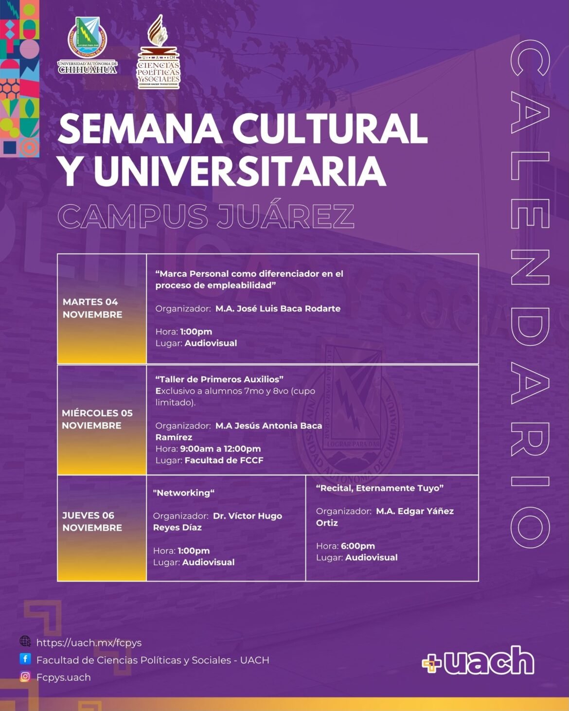 La Facultad de Ciencias Políticas y Sociales de la Universidad Autónoma de Chihuahua (UACH) impartirá este miércoles 5 de noviembre un Taller de Primeros Auxilios, dirigido exclusivamente a estudiantes de séptimo y octavo semestre.