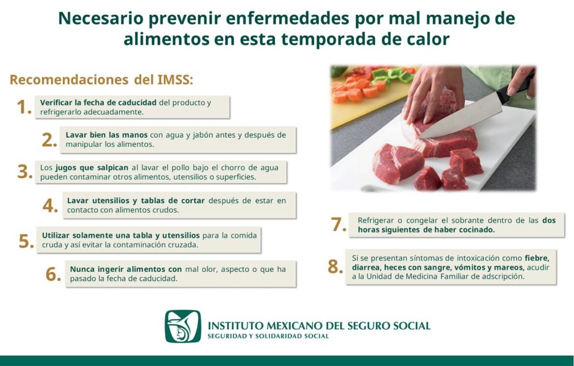 Ante las altas temperaturas en la entidad, y con el objetivo de prevenir enfermedades debido al mal manejo de alimentos, el Instituto Mexicano del Seguro Social (IMSS) en Chihuahua, informa a la población la importancia de extremar medidas preventivas al cocinar correctamente los productos de origen animal como el pollo, pescado y carne, ya que de no hacerlo se pone en riesgo la salud al provocar una intoxicación alimentaria. La coordinadora de Salud Pública, doctora Brenda Ramírez Vega, destacó que los alimentos de origen animal son de los más adquiridos en los hogares, por lo que, advirtió que el manipularlos de forma inadecuada puede ocasionar severos problemas al organismo.