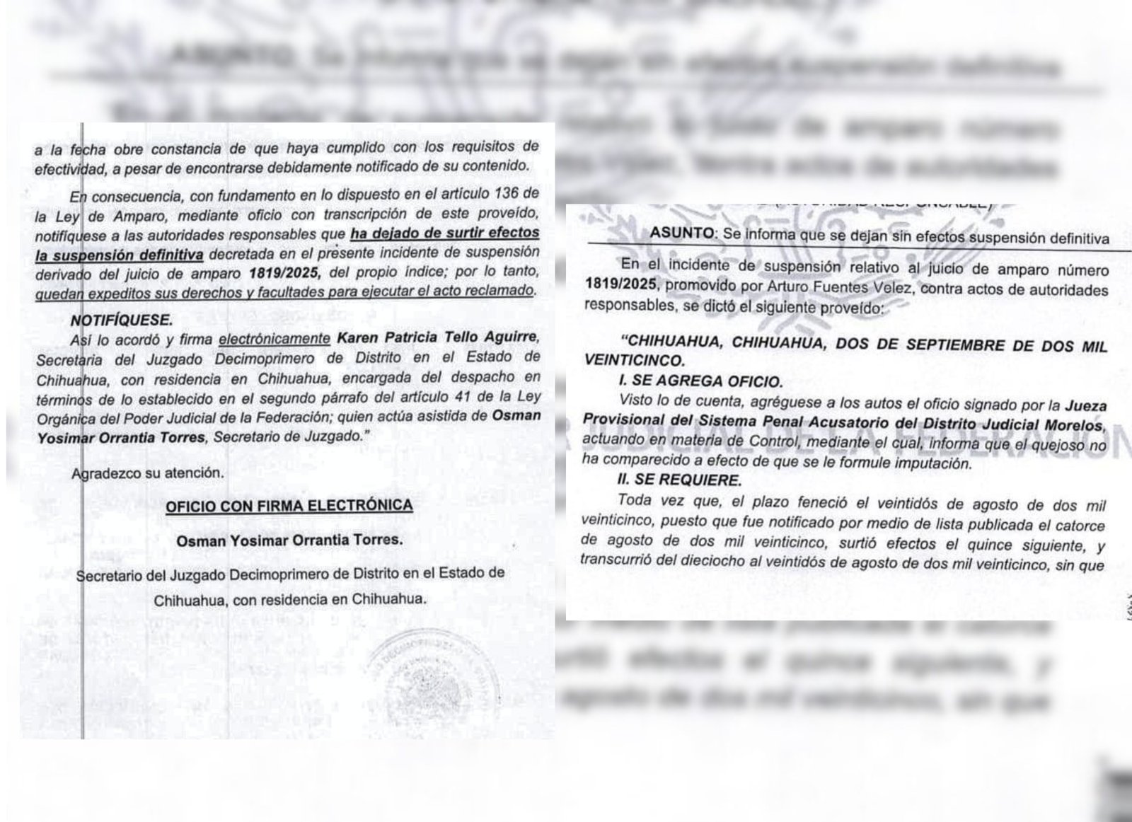 Derivado de las tres órdenes de aprehensión solicitadas por la Fiscalía Anticorrupción del Estado de Chihuahua y obsequiadas por Jueces de Control en contra del exsecretario de Hacienda, AFV, por delitos de peculado agravado en tres distintos hechos que superan los 743 MILLONES DE PESOS los Juzgados de Distrito dejaron sin efectos la suspensión definitiva por lo que el imputado se encuentra sustraído de la acción de la justicia (PRÓFUGO) por tres distintas causas penales.