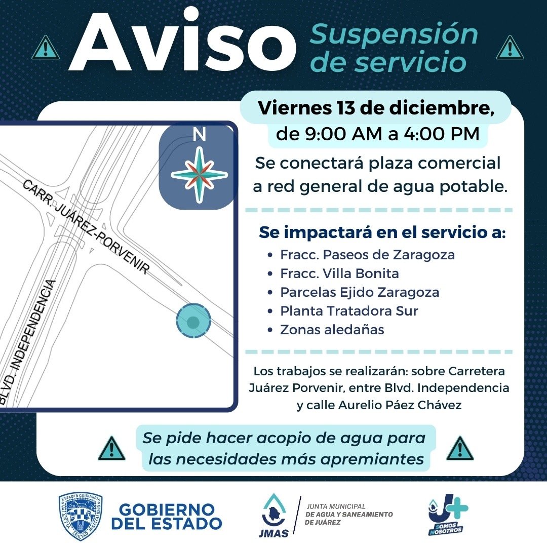 En consecuencia, mañana viernes, de 9:00 a 16:00 horas, se afectará la prestación del servicio de agua potable en los fraccionamientos Paseos de Zaragoza y Villa Bonita, en las Parcelas Ejido Zaragoza, en la Planta Tratadora Sur de la Junta de Agua y Saneamiento de Juárez y zonas aledañas.