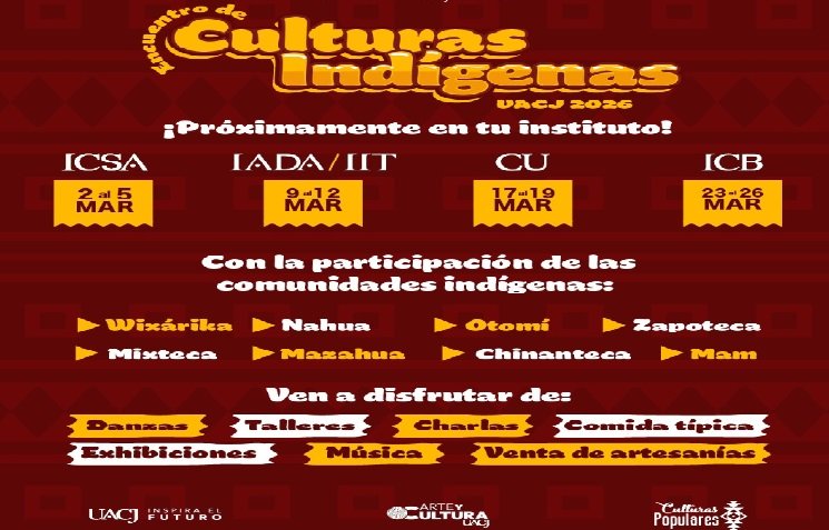 Continuando con la programación para acercar a los diferentes institutos de la Universidad Autónoma de Ciudad Juárez el evento Encuentro de culturas indígenas, la máxima casa de estudios informó que a partir de mañana 17 de marzo y hasta el 19 del mismo mes, el encuentro se realizará en la Ciudad Universitaria (CU).