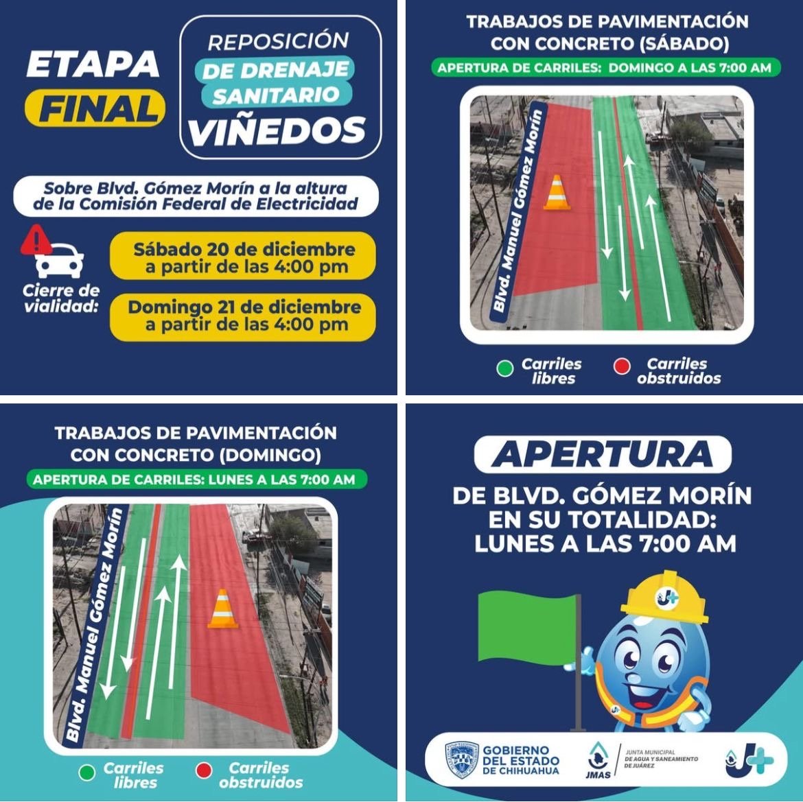 La Junta de Agua y Saneamiento de Juárez (J+) informa a la ciudadanía que, tras concluir la instalación del nuevo colector Viñedos, este sábado por la tarde iniciarán los trabajos de pavimentación en el bulevar Gómez Morín, una de las vialidades más importantes de la ciudad.