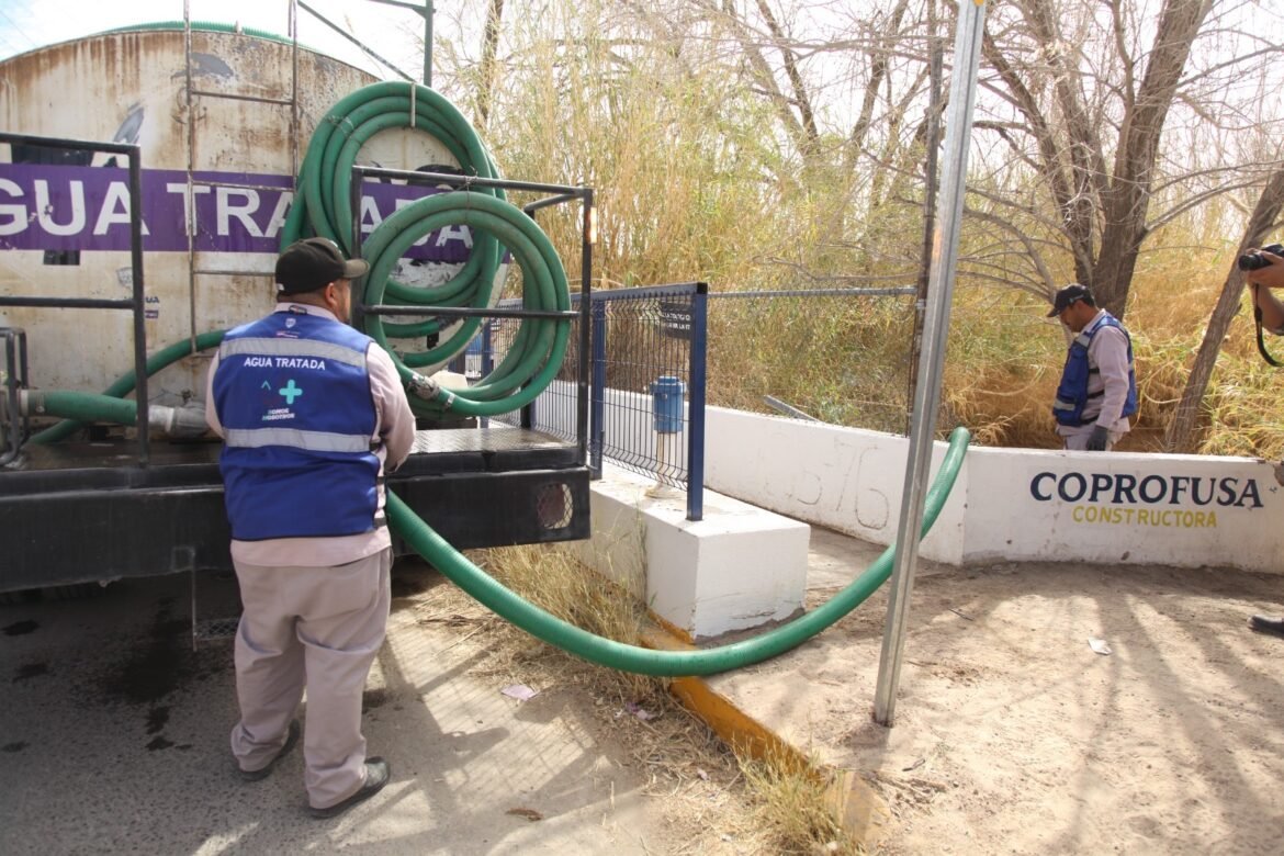 La Junta de Agua y Saneamiento de Juárez (J+) realiza trabajos de inyección de agua tratada en la Acequia Madre, a la altura de la calle Baudelio Pelayo, en el sector de Senecú Campestre, como parte del operativo para mejorar la fluidez del cauce.