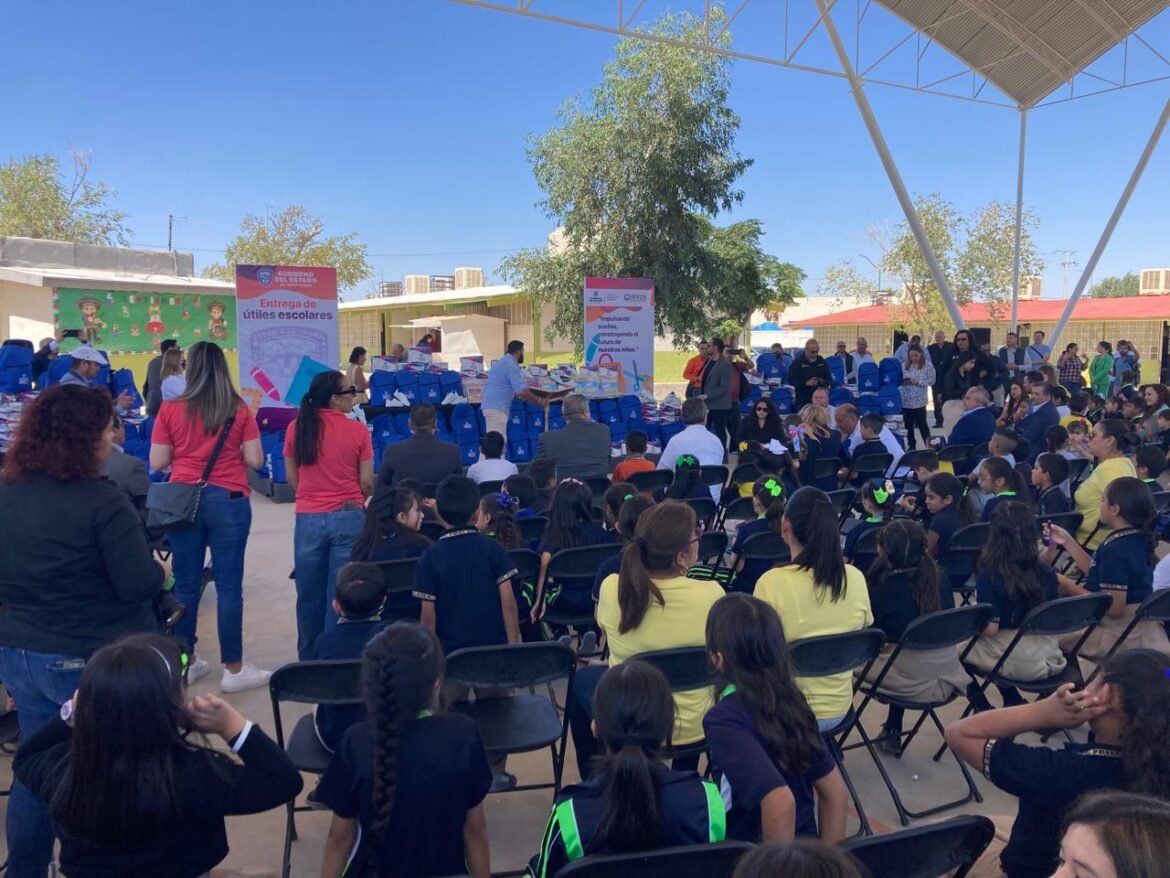 La gobernadora María Eugenia Campos lideró el inicio del programa de entrega de útiles escolares, mochilas y calzado para estudiantes de nivel básico en Ciudad Juárez.