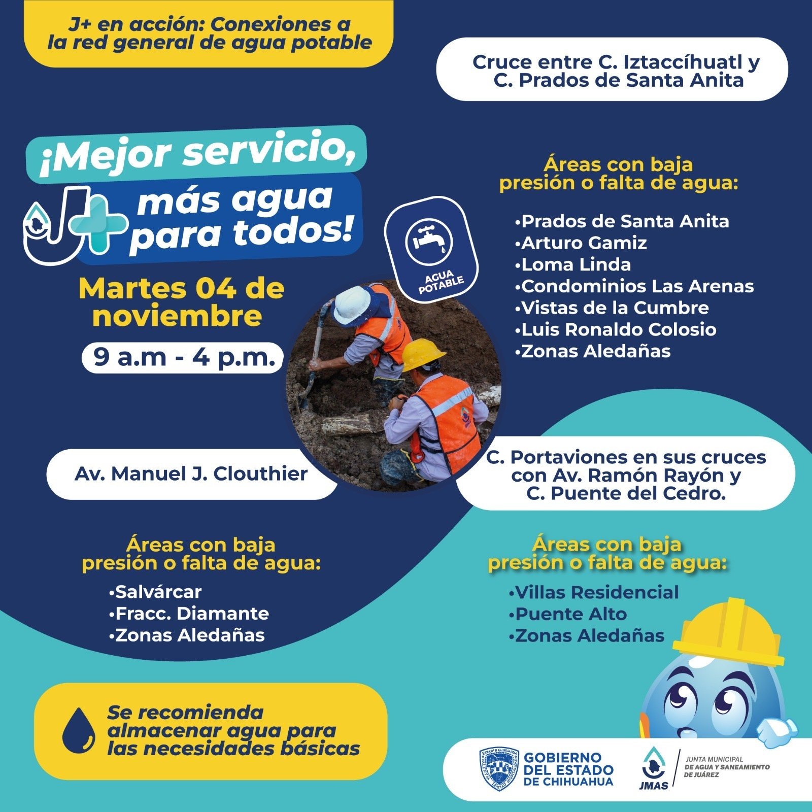 Este martes 4 de noviembre, la Junta de Agua y Saneamiento de Juárez conectará tres fraccionamientos a la red general de agua potable.