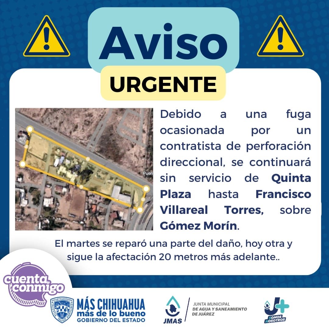 Debido a una fuga de agua originada desde la mañana del martes en varios puntos de una tubería de agua potable que corre por el bulevar Manuel Gómez Morín, la J+ informa que las afectaciones continuarán mañana jueves.