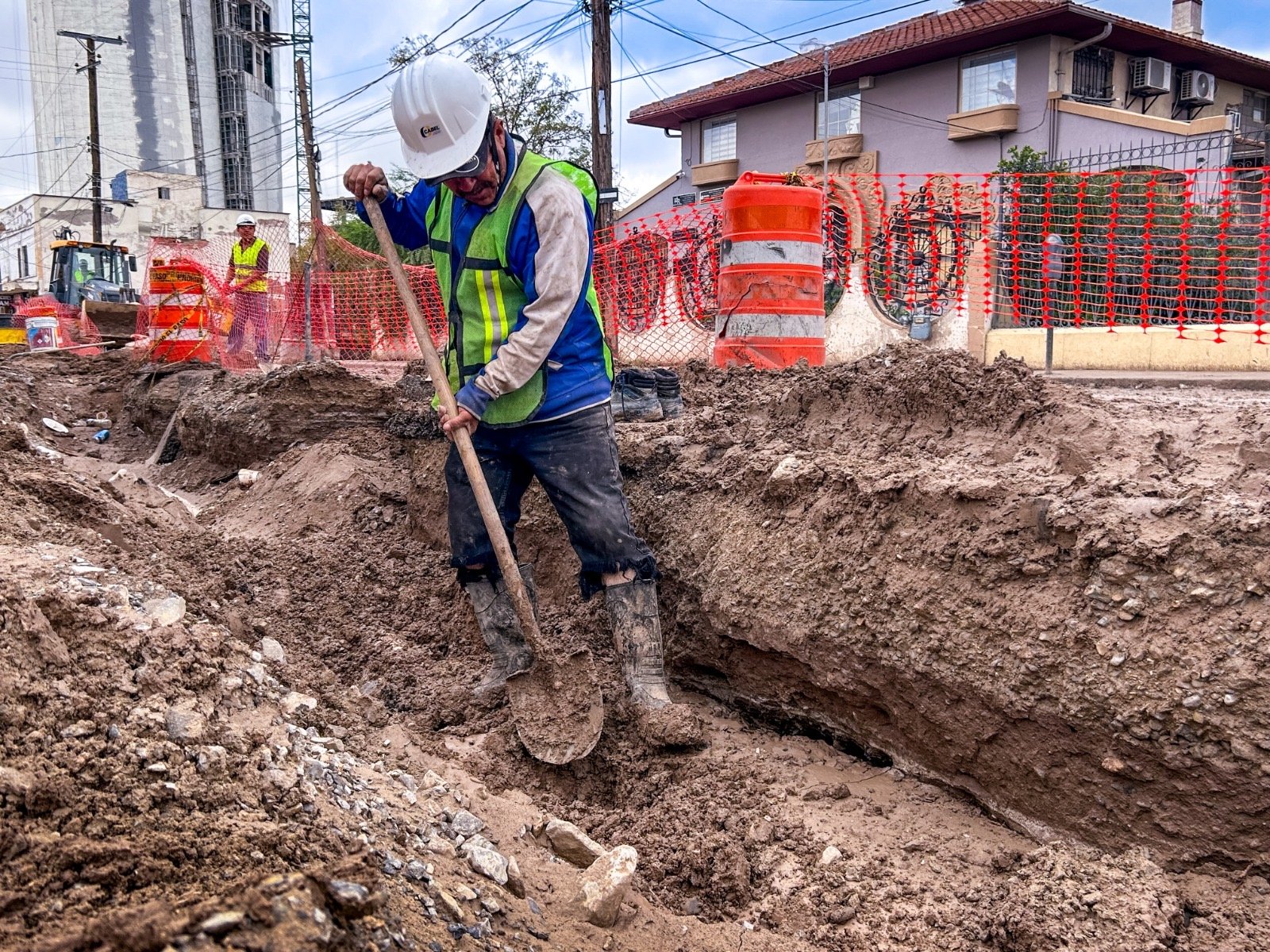 La Junta de Agua y Saneamiento de Juárez mantiene labores continuas en tres turnos, para finalizar los trabajos de reposición de líneas de agua potable en la calle Lerdo.
