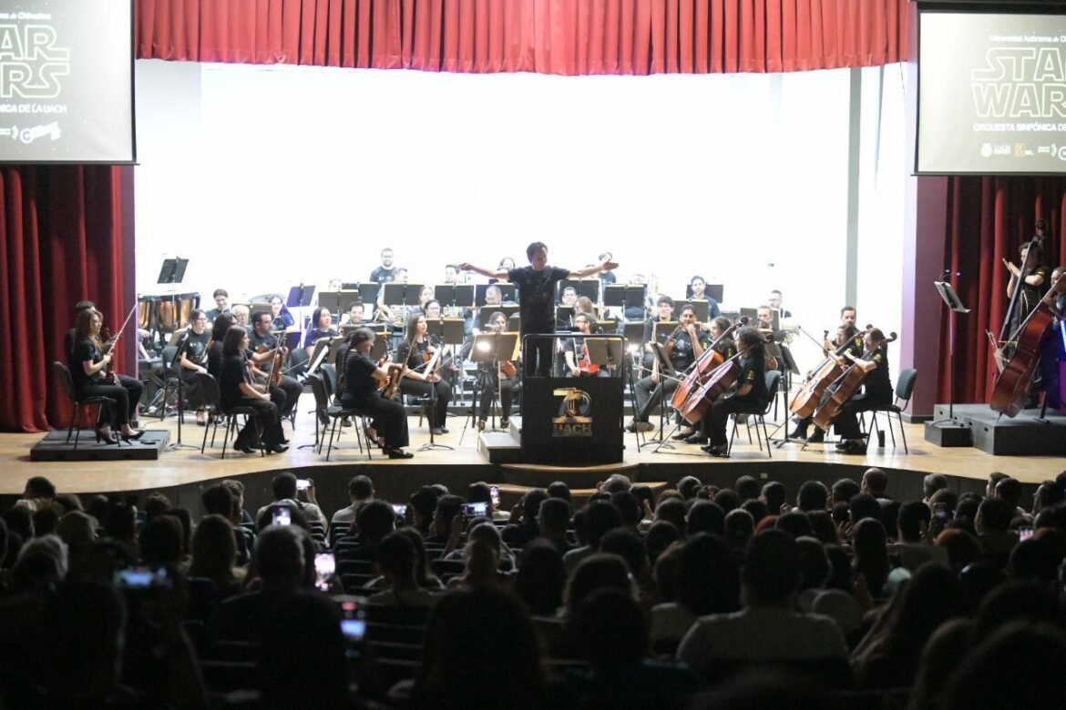 La Orquesta Sinfónica de la Universidad Autónoma de Chihuahua celebró el tradicional May the 4th Be With You, con un emotivo concierto temático dedicado a la icónica saga cinematográfica Star Wars, bajo la dirección artística del Mtro. David Pérez Olmedo. Durante el arranque, el Rector de la UACH, Mtro. Luis Alfonso Rivera Campos, expresó que este concierto ya se ha convertido en una tradición muy esperada y reconoció el talento de la orquesta: “Me es grato escuchar cada ensayo de la OSUACH; este evento refleja el esfuerzo y la pasión de nuestros músicos”, señaló. Además, reconoció la entusiasta participación del colectivo Celebration One Chihuahua, quienes, junto a la universidad, enriquecen año con año esta experiencia musical y cultural.