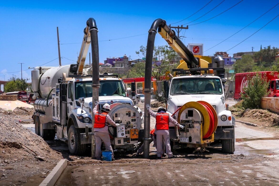 La Junta de Agua y Saneamiento de Juárez realiza trabajos intensivos de limpieza en las cajas desarenadoras del colector Norzagaray, ubicadas junto al monumento al Nuevo Ciudadano, mejor conocido como “el cigarro”.