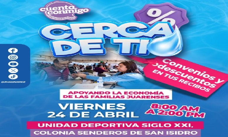 La Junta de Agua y Saneamiento de Juárez, invita a la ciudadanía a aprovechar su feria de servicios “Cerca de Ti”, este viernes 24 de abril en la Unidad Deportiva Siglo XXI, ubicada en la calle Monteblanco, en el fraccionamiento Senderos de San Isidro.