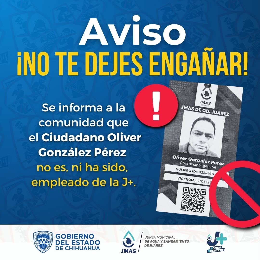 La J+ alerta a la ciudadanía sobre una persona, que dice llamarse Oliver González Pérez, quien con un gafete falso pretende hacerse pasar como empleado de la Junta de Agua y Saneamiento de Juárez y solicita ingresar a los domicilios argumentando que va a atender reportes levantados ante este organismo.