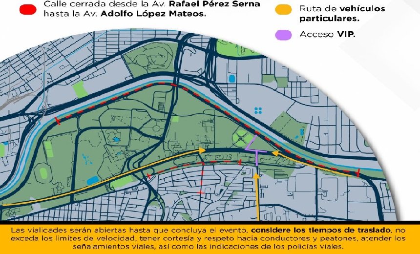 Las vialidades serán abiertas hasta que concluya el evento, por lo que se pide considerar los tiempos de traslado, no exceder los límites de velocidad, tener cortesía y respeto hacia conductores y peatones, atender los señalamientos viales, así como las indicaciones de los policías viales.