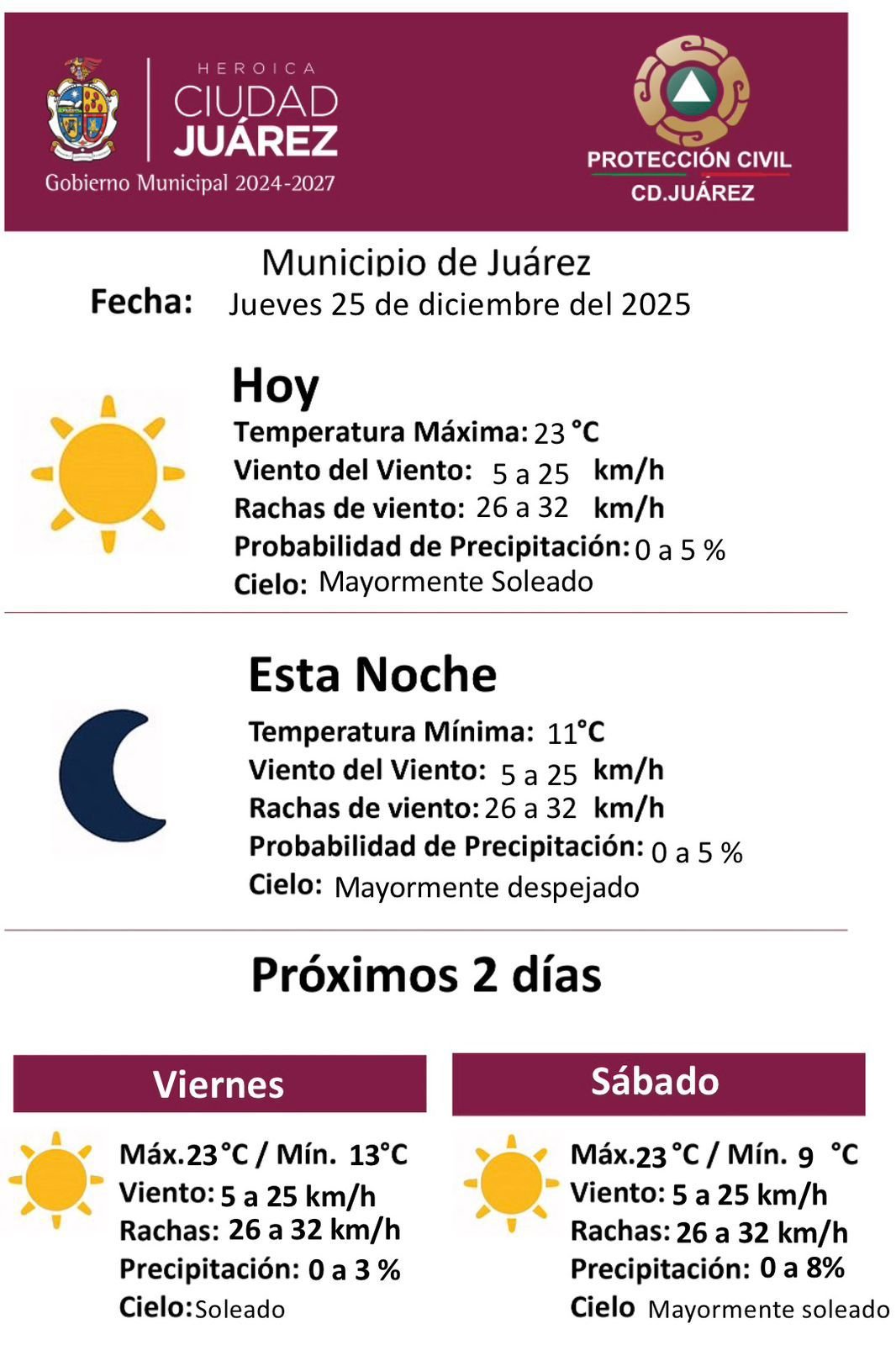 La Dirección General de Protección Civil informó que este jueves 25 de diciembre se espera un clima mayormente soleado en el municipio de Juárez, con una temperatura máxima de 23 grados centígrados. Durante el día, el viento se presentará con velocidades de entre 5 y 25 kilómetros por hora, con rachas que podrían alcanzar de 26 a 32 kilómetros por hora, mientras que la probabilidad de precipitación se mantiene baja, entre 0 y 5 por ciento.