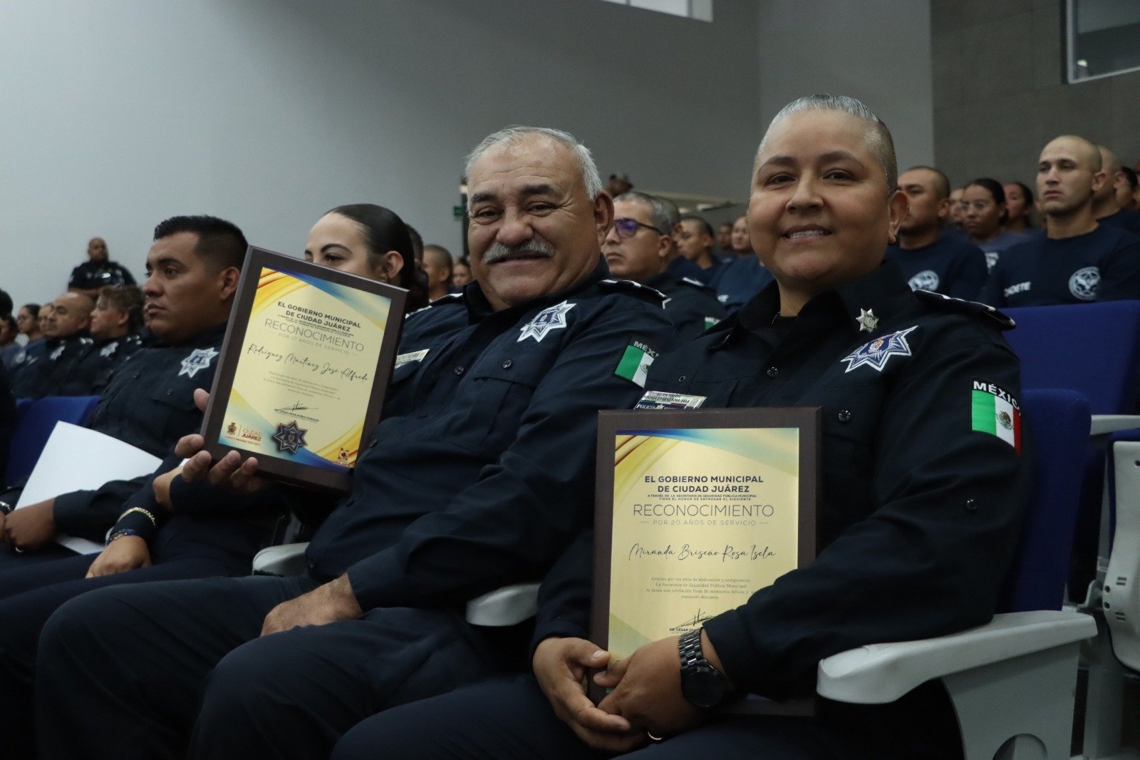 También fueron reconocidos 12 agentes de seguridad pública que llegaron a 20 años de servicio, a quienes se les entregó una medalla por perseverancia, además de tres agentes municipales y un agente vial que fueron destacados por obtener su jubilación tras estar en las filas de la corporación por un largo tiempo de sus vidas, quienes fueron condecorados con una placa como reconocimiento.