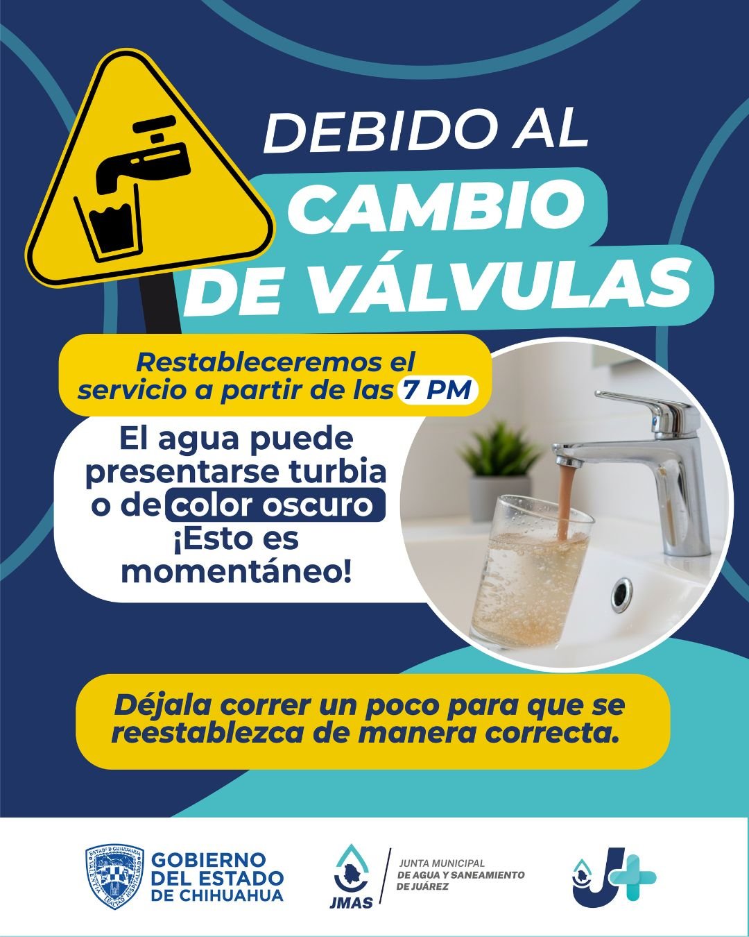La Junta de Agua y Saneamiento de Ciudad Juárez, informa que a partir de las 7 de la tarde se iniciará a restablecer el servicio de agua potable en algunas zonas de la ciudad, derivado de los cambios de válvulas en 15 puntos de la ciudad.